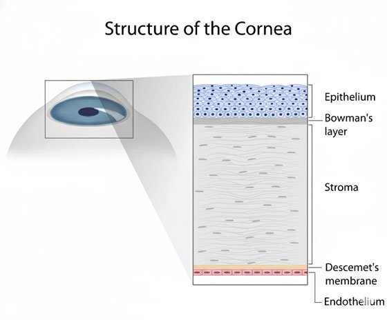 Although the cornea is clear and looks simple, it is a highly complex tissue composed of five distinct layers: